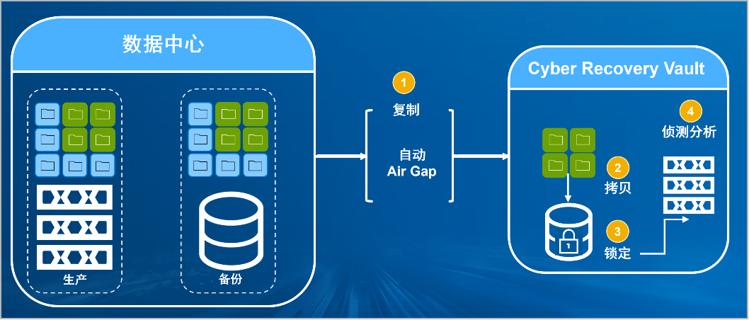神州db视讯官网防勒索病毒方案将生产中心备份数据复制到Vault区,复制后网络自动断开实现弹性隔离。Vault区的数据快速拷贝,并对拷贝版本加锁(在锁定期数据不允许删除和修改)。Vault沙箱内对拷贝版本进行扫描分析,验证数据是否完好。